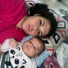 Em casa sou eu e meu marido e minha sogra, os dois trabalham e eu estou querendo trabalhar também mas não tem ninguém que fique com meu bebê, meu bebê é calmo e sorridente, chora quando ta com fome e quando quer dormir ...
